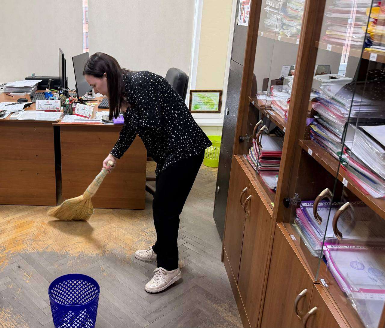 Для удобства коллектив ведомства разделился на две группы. Одна часть сотрудников наводила порядок на рабочих местах, а другая выехала на улицу Сочинскую, пострадавшую от недавних паводков.